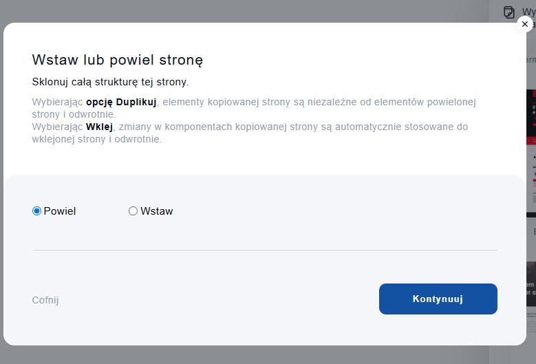 • Wstaw – nowa strona zostanie podlinkowana do oryginalnej, a wszelkie zmiany wykonane na jednej stronie zostaną automatycznie odwzorowane na drugiej.